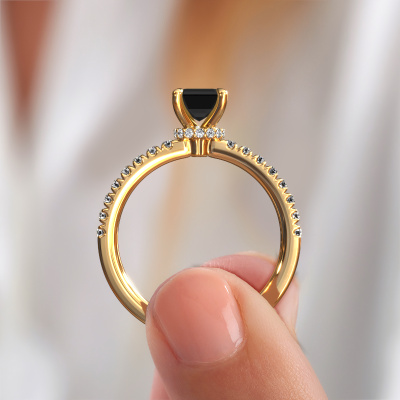 Der oben gezeigte Gold Verlobungsring wird Crystal EME 4 genannt. Es ist ein Pavé Solitär Ring, da er einen zentralen Edelstein und ein Band mit Pavé-Fassung hat. Der modische Pavé Solitär Verlobungsring ist in der Kombination 14 Karat Gold mit Gold und ist mit einem smaragd schliff 1.380 crt Schwarz Diamant-Mittelstein besetzt und das Band hat eine Pavé-Fassung mit Lab grown Diamant. Jedes Schmuckstück ist um Ihrem Finger Glanz zu verleihen. Jeder Ring wird von unseren Goldschmieden liebevoll von Hand gefertigt. Um den zentralen Stein noch mehr zu betonen, hat das Band eine Pavé-Fassung mit weiteren Schwarz Diamant. Durch die offenen Krappen kann das Licht aus mehreren Winkeln auf den Schwarz Diamant treffen und der Schwarz Diamant-Ring funkelt noch mehr. Das obere Foto zeigt die leidenschaftlich handgefertigten Details des Rings. Die hohe Positionierung der Mittelstein ist ein echter Blickfang. Der perfekte Verlobungsring für das Kronjuwel Ihres Lebens!Nach Erhalt Ihrer Bestellung beginnen unsere Goldschmiede mit Leidenschaft den kreativen Prozess und fertigen Ihren Verlobungsring in unserem eigenen Studio. Da wir keine großen Lager haben, werden diese Kosten nicht an Sie weitergegeben. Unsere Preisgestaltung ist der Beweis dafür! Wir bieten Schmuck zum niedrigsten Preis, garantiert.Unser Team fügt unserer Online-Kollektion täglich neue Designs hinzu. Unsere Designer und Goldschmiede arbeiten zusammen, um das beste Design zu kreieren. Wir bemühen uns, eine vielfältige Kollektion von Schmuckstücken anzubieten. Vielleicht haben Sie ein bestimmtes Design im Sinn. Eines, dass Sie irgendwo gesehen haben. Gerne geben wir Ihnen eine kostenlose Beratung. Wir machen Ihnen ein Angebot, basierend auf einem fairen Preis/Leistungsverhältnis, das Sie verblüffen wird.Um es einfacher zu machen, bieten wir eine kostenlose 30-tägige Rücksendung.