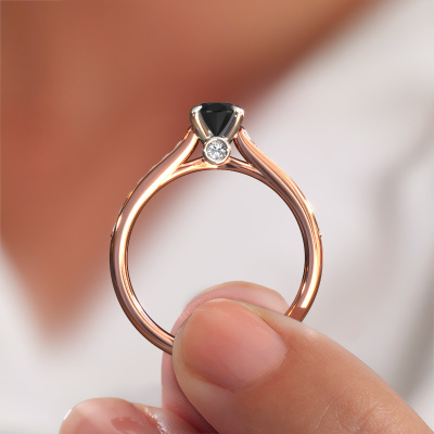 Der oben gezeigte Ring wird Valorie ovl 2 genannt. Es ist ein Pavé Solitär Ring, da er einen zentralen Edelstein und ein Band mit Pavé-Fassung hat. Dieser 14 Karat Roségold ring ist mit einem 1.05 crt oval Schwarz Diamant-Mittelstein besetzt und das Band hat eine Pavé-Fassung mit Lab grown Diamant. Jedes Schmuckstück wird hergestellt mit Leidenschaft und Liebe, von einem unserer Meister-Goldschmiede.Dieser modische Roségold Pavé Solitär Verlobungsring mit Pavé-Fassung hat einen exquisiten, oval Schwarz Diamant als Mittelstein. Um den zentralen Stein noch mehr zu betonen, hat das Band eine Pavé-Fassung mit weiteren Lab grown Diamant. Durch die offenen Krappen kann das Licht aus mehreren Winkeln auf den Schwarz Diamant treffen und der Schwarz Diamant-Ring funkelt noch mehr. Das obere Foto zeigt die leidenschaftlich handgefertigten Details des Rings. Die hohe Positionierung der Mittelstein ist ein echter Blickfang. Der perfekte Verlobungsring für das Kronjuwel Ihres Lebens!Haben Sie ein bestimmtes Budget? Sie können uns gerne kontaktieren, damit wir Ihre Optionen besprechen können. Wir bieten unsere Verlobungsringe zum garantiert besten Preis, denn wir fertigen sie auf Bestellung. Solche Preise finden Sie nirgendwo anders!Unser Team fügt unserer Online-Kollektion täglich neue Designs hinzu. Unsere Designer und Goldschmiede arbeiten zusammen, um das beste Design zu kreieren. Wir bemühen uns, eine vielfältige Kollektion von Schmuckstücken anzubieten. Vielleicht haben Sie ein bestimmtes Design im Sinn. Eines, dass Sie irgendwo gesehen haben. Gerne geben wir Ihnen eine kostenlose Beratung. Wir machen Ihnen ein Angebot, basierend auf einem fairen Preis/Leistungsverhältnis, das Sie verblüffen wird.Um es einfacher zu machen, bieten wir eine kostenlose 30-tägige Rücksendung.