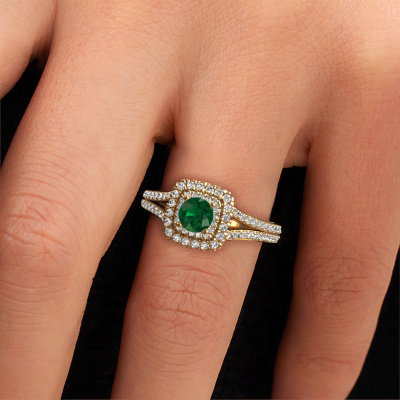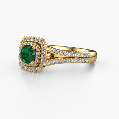 Der oben gezeigte Gold Verlobungsring wird Annette genannt. Es ist ein Halo Ring, da er einen zentralen Edelstein und ein Band mit Pavé-Fassung hat. Der Vintage Halo Verlobungsring ist in der Kombination 14 Karat Gold mit Gold und ist mit einem rund 5 mm Smaragd-Mittelstein besetzt und das Band hat eine Pavé-Fassung mit Diamanten. Jedes Schmuckstück wird von unseren Meister-Goldschmieden in unserem eigenen Studio für Sie gefertigt. Um den zentralen Stein noch mehr zu betonen, hat das Band eine Pavé-Fassung mit weiteren Smaragd. Durch die offenen Krappen kann das Licht aus mehreren Winkeln auf den Smaragd treffen und der Smaragd-Ring funkelt noch mehr. Das obere Foto zeigt die leidenschaftlich handgefertigten Details des Rings. Die hohe Positionierung der Mittelstein ist ein echter Blickfang. Der perfekte Verlobungsring für das Kronjuwel Ihres Lebens!Nach Erhalt Ihrer Bestellung beginnen unsere Goldschmiede mit Leidenschaft den kreativen Prozess und fertigen Ihren Verlobungsring in unserem eigenen Studio. Da wir keine großen Lager haben, werden diese Kosten nicht an Sie weitergegeben. Unsere Preisgestaltung ist der Beweis dafür! Wir bieten Schmuck zum niedrigsten Preis, garantiert.Haben Sie irgendwo einen bestimmten Verlobungsring gefunden, den Sie Ihrem Liebsten schenken möchten? Sie können uns gerne sagen, was Sie wollen und wir werden Ihr Design in einen Einzigartigen Vintage Verlobungsring verwandeln. Sie können die Entwicklungen Ihres Ringdesigns verfolgen, da wir 3D-Zeichnungen verwenden. Das gibt Ihnen eine realistische Vorschau, wie Ihr Design aussehen wird. Sie können auch einen Dummy vorbestellen. Ein Dummy ist ein Kunststoffring, der nach Ihrem Ringdesign gestaltet werden kann. Sie können ihn anprobieren und prüfen, ob seine Breite und Größe für Sie geeignet sind. Wir senden Ihnen gerne ein unverbindliches Angebot zu einem fairen Preis/Leistungsverhältnis. Sie werden in Anbetracht der Qualität des Rings und der Edelsteine überrascht sein.Um es einfacher zu machen, bieten wir eine kostenlose 30-tägige Rücksendung.