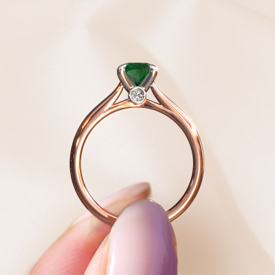 Der oben gezeigte Verlobungsring wird Valorie cus 1 genannt. Wir nennen das einen Solitär-Ring, denn er hat einen einzelnen Edelstein. Es ist ein 14 Karat Roségold ring, mit 6 mm cussion Smaragd. Das Besondere an unserem Konfigurator ist dass Sie selbst einem Schmuckstück zusammenstellen können zu einem eigenen persönlichen Schmuckstück. Dieser Solitäre Verlobungsring ist gefertigt in der Edelmetall Kombination Roségold mit Weißgold, aber Sie können also auch wählen aus anderen Farben. Jedes Schmuckstück lässt Ihren Finger erstrahlen. Ihr Ring ist mit Liebe von unseren Goldschmieden handgefertigt. Der Solitär-Verlobungsring ist eine Sonderform des Verlobungsring. Seine offenen Krappen ermöglichen, dass Licht aus mehr Winkeln auf den Edelstein trifft. Dieser klassische Verlobungsring ist durch die hohe Positionierung des Edelsteins ein atemberaubender Blickfang. Wir schmücken diesen Solitär-Ring sorgfältig von Hand, damit Sie Ihren Anfrage mit einem einzigartigen Ring würdigen können. Die Liebe Ihres Lebens verdient nur das Beste. Haben Sie ein bestimmtes Budget? Sie können uns gerne kontaktieren, damit wir Ihre Optionen besprechen können. Wir bieten unsere Verlobungsringe zum garantiert besten Preis, denn wir fertigen sie auf Bestellung. Solche Preise finden Sie nirgendwo anders!Haben Sie irgendwo einen bestimmten Verlobungsring gefunden, den Sie Ihrem Liebsten schenken möchten? Sie können uns gerne sagen, was Sie wollen und wir werden Ihr Design in einen Einzigartigen klassische Verlobungsring verwandeln. Sie können die Entwicklungen Ihres Ringdesigns verfolgen, da wir 3D-Zeichnungen verwenden. Das gibt Ihnen eine realistische Vorschau, wie Ihr Design aussehen wird. Sie können auch einen Dummy vorbestellen. Ein Dummy ist ein Kunststoffring, der nach Ihrem Ringdesign gestaltet werden kann. Sie können ihn anprobieren und prüfen, ob seine Breite und Größe für Sie geeignet sind. Wir senden Ihnen gerne ein unverbindliches Angebot zu einem fairen Preis/Leistungsverhältnis. Sie werden in Anbetracht der Qualität des Rings und der Edelsteine überrascht sein.Um es einfacher zu machen, bieten wir eine kostenlose 30-tägige Rücksendung.