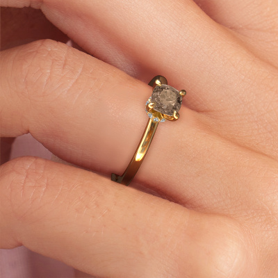 Der oben gezeigte Verlobungsring wird Crystal CUS 3 genannt. Wir nennen das einen Solitär-Ring, denn er hat einen einzelnen Edelstein. Es ist ein 14 Karat Gold Verlobungsring, mit 0.70 crt cussion Braun Diamant. Dieser modische Gold Solitär-Ring mit exquisitem, cussion Braun Diamant ist ein schöner Verlobungsring. Die offenen Krappen ermöglichen, dass Licht aus mehr Winkeln auf den Edelstein trifft. Der Ring besticht auch durch die hohe Positionierung des Edelsteins. Denn Braun Diamant symbolisieren wahre Liebe und Reinheit und machen sie damit zum perfekten Geschenk für die Liebe Ihres Lebens. Das Symbol der ewigen Liebe ist das Herzstück dieses Solitär-Rings. Wie ein Braun Diamant haben auch alle anderen Arten von Edelmetallen ihre eigenen, zugeschriebenen symbolischen Bedeutungen. Diese Solitär Verlobungsring können Sie selbst zusammenstellen in verschiedenen Edelmetall Kombinationen. Dieser hat die Kombination 14 Karat Gold mit Gold. Jedes Schmuckstück wird hergestellt von einem Team leidenschaftlicher Goldschmiede und Schmuckdesigner. Das wird Ihr Kronjuwel unbedingt zu einem Blickfang machen.Durch die Kombination modernster Technik mit uralter Handwerkskunst können wir alle Verlobungsringe in unserem eigenen Studio anfertigen. Jedes Schmuckstück wird auf Anfrage gefertigt. Das ist vorteilhaft, weil wir Ihnen dadurch einen Preis anbieten können, den Sie nirgendwo anders finden.Unsere Designer und Goldschmiede arbeiten jeden Tag zusammen und versuchen, neue Schmuckstücke zu kreieren. Vielleicht haben Sie irgendwo einen schönen, modische Verlobungsring gefunden, nach dem Ihr einzigartiger Ring gestaltet werden kann. Setzen Sie sich mit uns in Verbindung. Wir machen Ihnen ein Angebot, basierend auf einem fairen Preis/Leistungsverhältnis, das Sie begeistern wird.Um es einfacher zu machen, bieten wir eine kostenlose 30-tägige Rücksendung.