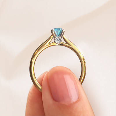 Der oben gezeigte Verlobungsring wird Valorie ovl 1 genannt. Wir nennen das einen Solitär-Ring, denn er hat einen einzelnen Edelstein. Es ist ein 14 Karat Gold Verlobungsring, mit 6.5x4.5 mm oval Blau Topas. Dieser moderne Gold Solitär-Ring mit exquisitem, oval Blau Topas ist ein schöner Verlobungsring. Die offenen Krappen ermöglichen, dass Licht aus mehr Winkeln auf den Edelstein trifft. Der Ring besticht auch durch die hohe Positionierung des Edelsteins. Denn Blau Topas symbolisieren wahre Liebe und Reinheit und machen sie damit zum perfekten Geschenk für die Liebe Ihres Lebens. Das Symbol der ewigen Liebe ist das Herzstück dieses Solitär-Rings. Wie ein Blau Topas haben auch alle anderen Arten von Edelmetallen ihre eigenen, zugeschriebenen symbolischen Bedeutungen. Diese Solitär Verlobungsring können Sie selbst zusammenstellen in verschiedenen Edelmetall Kombinationen. Dieser hat die Kombination 14 Karat Gold mit Weißgold. Jedes Schmuckstück wird nur für Sie persönlich hergestellt, mit Liebe zum Detail und Design.Mit unserer modernen Technik können wir Schmuckstücke von höchster Qualität mit größter Sorgfalt für Sie entwerfen und anpassen. Unsere Verlobungsringe sind immer um 30 Prozent günstiger als bei anderen Juwelieren. Wir fertigen Verlobungsringe auf Bestellung, also müssen wir keine großen Lager unterhalten. Wenn Sie ein bestimmtes Budget haben, beraten wir Sie gerne entsprechend.Haben Sie einen bestimmten Ring im Sinn? Eines, dass Sie irgendwo gesehen haben. Bitte zögern Sie nicht, uns zu sagen, was Sie wollen und wir werden Ihr Design in einen Einzigartigen Verlobungsring verwandeln. Sie können die Entwicklungen Ihres Ringdesigns verfolgen, da wir 3D-Zeichnungen verwenden. Das gibt Ihnen eine realistische Vorschau Ihres Designs. Wir senden Ihnen gerne ein unverbindliches Angebot zu einem fairen Preis/Leistungsverhältnis. Es wird Sie erstaunen.Um es einfacher zu machen, bieten wir eine kostenlose 30-tägige Rücksendung.
