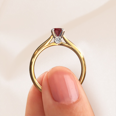 Der oben gezeigte Verlobungsring wird Valorie ovl 1 genannt. Wir nennen das einen Solitär-Ring, denn er hat einen einzelnen Edelstein. Es ist ein 14 Karat Gold Verlobungsring, mit 6.5x4.5 mm oval Rubin. Dieser moderne Gold Solitär-Ring mit exquisitem, oval Rubin ist ein schöner Verlobungsring. Die offenen Krappen ermöglichen, dass Licht aus mehr Winkeln auf den Edelstein trifft. Der Ring besticht auch durch die hohe Positionierung des Edelsteins. Denn Rubin symbolisieren wahre Liebe und Reinheit und machen sie damit zum perfekten Geschenk für die Liebe Ihres Lebens. Das Symbol der ewigen Liebe ist das Herzstück dieses Solitär-Rings. Wie ein Rubin haben auch alle anderen Arten von Edelmetallen ihre eigenen, zugeschriebenen symbolischen Bedeutungen. Diese Solitär Verlobungsring können Sie selbst zusammenstellen in verschiedenen Edelmetall Kombinationen. Dieser hat die Kombination 14 Karat Gold mit Weißgold. Jedes Schmuckstück wird nur für Sie persönlich hergestellt, mit Liebe zum Detail und Design.Mit unserer modernen Technik können wir Schmuckstücke von höchster Qualität mit größter Sorgfalt für Sie entwerfen und anpassen. Unsere Verlobungsringe sind immer um 30 Prozent günstiger als bei anderen Juwelieren. Wir fertigen Verlobungsringe auf Bestellung, also müssen wir keine großen Lager unterhalten. Wenn Sie ein bestimmtes Budget haben, beraten wir Sie gerne entsprechend.Haben Sie einen bestimmten Ring im Sinn? Eines, dass Sie irgendwo gesehen haben. Bitte zögern Sie nicht, uns zu sagen, was Sie wollen und wir werden Ihr Design in einen Einzigartigen Verlobungsring verwandeln. Sie können die Entwicklungen Ihres Ringdesigns verfolgen, da wir 3D-Zeichnungen verwenden. Das gibt Ihnen eine realistische Vorschau Ihres Designs. Wir senden Ihnen gerne ein unverbindliches Angebot zu einem fairen Preis/Leistungsverhältnis. Es wird Sie erstaunen.Um es einfacher zu machen, bieten wir eine kostenlose 30-tägige Rücksendung.