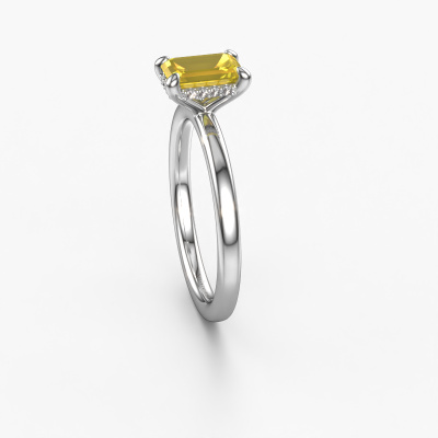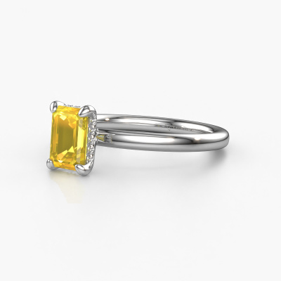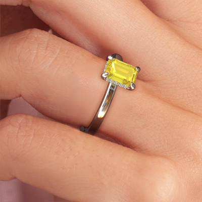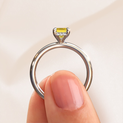 Der oben gezeigte Verlobungsring wird Simone EME 2 genannt. Wir nennen das einen Solitär-Ring, denn er hat einen einzelnen Edelstein. Es ist ein 14 Karat Weißgold Verlobungsring, mit 7x5 mm smaragd schliff Gelb Saphir. Dieser außergewöhnliche, traditionell Weißgold Solitär-Verlobungsring mit einem schönen, smaragd schliff Gelb Saphir soll Ihrem Antrag ein Funkeln geben. Die offenen Krappen ermöglichen, dass Licht aus mehr Winkeln auf den Edelstein trifft. Wussten Sie, dass ein Gelb Saphir für ewige Liebe und Treue steht? Das macht ihn zum perfekten Mittelstück. Unsere Goldschmiede positioniert den Edelstein Ihrer Wahl sorgfältig oben auf dem Ring. Dadurch sticht er hervor. Jedes Schmuckstück wird hergestellt von einem Team leidenschaftlicher Goldschmiede und Schmuckdesigner. Das wird Ihr Kronjuwel unbedingt zu einem Blickfang machen.Mit unserer modernen Technik können wir Schmuckstücke von höchster Qualität mit größter Sorgfalt für Sie entwerfen und anpassen. Unsere Verlobungsringe sind immer um 30 Prozent günstiger als bei anderen Juwelieren. Wir fertigen Verlobungsringe auf Bestellung, also müssen wir keine großen Lager unterhalten. Wenn Sie ein bestimmtes Budget haben, beraten wir Sie gerne entsprechend.Haben Sie einen bestimmten Ring im Sinn? Eines, dass Sie irgendwo gesehen haben. Bitte zögern Sie nicht, uns zu sagen, was Sie wollen und wir werden Ihr Design in einen Einzigartigen Verlobungsring verwandeln. Sie können die Entwicklungen Ihres Ringdesigns verfolgen, da wir 3D-Zeichnungen verwenden. Das gibt Ihnen eine realistische Vorschau Ihres Designs. Wir senden Ihnen gerne ein unverbindliches Angebot zu einem fairen Preis/Leistungsverhältnis. Es wird Sie erstaunen.Um es einfacher zu machen, bieten wir eine kostenlose 30-tägige Rücksendung.
