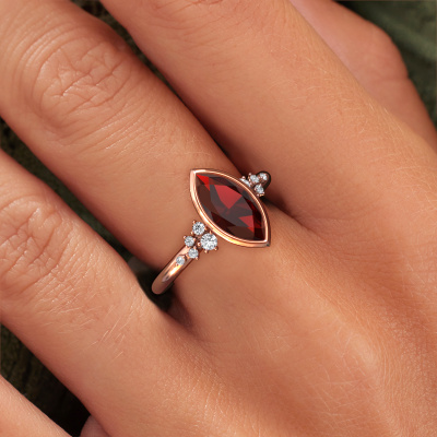 Dieser Verlobungsring aus 585 Roségold heißt Aliyah MRQ. Sind Sie auf der Suche nach einem trendige, Roségold Verlobungsring mit Granat 11x5.5 mm, den Sie nach Ihren Wünschen gestalten können? Dieser trendige Verlobungsring ist mit Granat besetzt, der sorgfältig für diesen speziellen Ring ausgewählt wurde, um den besten Effekt zu erzielen. Unser erfahrener Juwelier kreiert Ihren Ring in unserem eigenen Studio eine Etage tiefer, wo der Granat mit großer Sorgfalt eingefasst wird. Der Ring wird dann bearbeitet und poliert, bis er perfekt ist. Nichts als das Beste für die Liebe Ihres Lebens! Das Besondere an unserem Konfigurator ist dass Sie selbst einem Schmuckstück zusammenstellen können zu einem eigenen persönlichen Schmuckstück. Jedes Schmuckstück wird hergestellt von einem Team leidenschaftlicher Goldschmiede und Schmuckdesigner. Das wird Ihr Kronjuwel unbedingt zu einem Blickfang machen.. Mit unserer modernen Technik können wir Schmuckstücke von höchster Qualität mit größter Sorgfalt für Sie entwerfen und anpassen. Unsere Verlobungsringe sind immer um 30 Prozent günstiger als bei anderen Juwelieren. Wir fertigen Verlobungsringe auf Bestellung, also müssen wir keine großen Lager unterhalten. Wenn Sie ein bestimmtes Budget haben, beraten wir Sie gerne entsprechend.Unsere Designer und Goldschmiede arbeiten jeden Tag zusammen und versuchen, neue Schmuckstücke zu kreieren. Vielleicht haben Sie irgendwo einen schönen, trendige Verlobungsring gefunden, nach dem Ihr einzigartiger Ring gestaltet werden kann. Setzen Sie sich mit uns in Verbindung. Wir machen Ihnen ein Angebot, basierend auf einem fairen Preis/Leistungsverhältnis, das Sie begeistern wird.Um es einfacher zu machen, bieten wir eine kostenlose 30-tägige Rücksendung.
