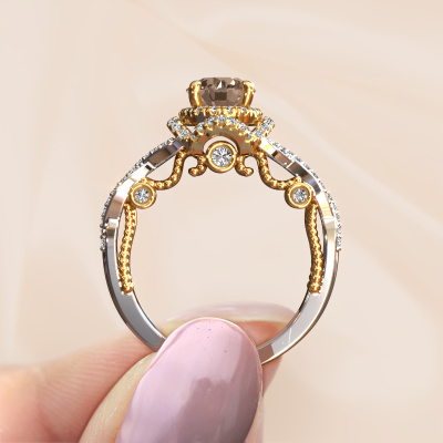 Der oben gezeigte Verlobungsring wird Leora genannt. Es ist ein Halo Ring, da er einen zentralen Edelstein und ein Band mit Pavé-Fassung hat. Der 14 Karat Weißgold ring ist mit einem 1.00 crt rund Braun Diamant-Mittelstein besetzt und um ihn herum eine Pavé-Fassung mit Lab grown Diamant. Was diesen Vintage, Weißgold Halo Ring besonders macht, sind die kleineren Steine, die den zentralen Stein umschließen. Dieser wunderschöne Verlobungsring wird als Halo Ring bezeichnet, da die kleineren Edelsteine dem zentralen Stein einen Lichthof geben. Damit die kleineren Steine den Mittelstein verstärken, müssen sie so platziert werden, dass keine Lichteinflüsse auftreten. Und hier kommen unsere erfahrenen Goldschmiede ins Spiel. Jeder einzelne Stein wird sorgfältig von Hand in den Ring gesetzt. Während der Herstellung wird der Lichteinfall ständig überprüft. So können wir sicherstellen, dass der spezielle Lichtkranz noch sichtbar ist. Am Ende erhalten Sie einen einzigartigen Verlobungsring mit einem Braune Diamanten Ihrer Wahl in der Mitte. Sie können sich die Wirkung eines solchen Ringes vorstellen, wenn Sie ihn an ihrem besonderen Tag für sie zum Leuchten bringen. Mit unserer modernen Technik können wir Schmuckstücke von höchster Qualität mit größter Sorgfalt für Sie entwerfen und anpassen. Unsere Verlobungsringe sind immer um 30 Prozent günstiger als bei anderen Juwelieren. Wir fertigen Verlobungsringe auf Bestellung, also müssen wir keine großen Lager unterhalten. Wenn Sie ein bestimmtes Budget haben, beraten wir Sie gerne entsprechend.Unsere Designer und Goldschmiede arbeiten jeden Tag zusammen und versuchen, neue Schmuckstücke zu kreieren. Vielleicht haben Sie irgendwo einen schönen, Vintage Verlobungsring gefunden, nach dem Ihr einzigartiger Ring gestaltet werden kann. Setzen Sie sich mit uns in Verbindung. Wir machen Ihnen ein Angebot, basierend auf einem fairen Preis/Leistungsverhältnis, das Sie begeistern wird.Um es einfacher zu machen, bieten wir eine kostenlose 30-tägige Rücksendung.