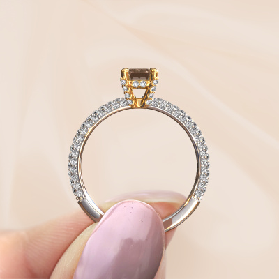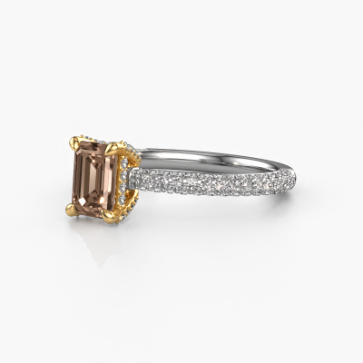 Der oben gezeigte Weißgold Verlobungsring wird Saskia eme 2 genannt. Es ist ein Pavé Solitär Ring, da er einen zentralen Edelstein und ein Band mit Pavé-Fassung hat. Der exklusive Pavé Solitär Verlobungsring ist in der Kombination 14 Karat Weißgold mit Gold und ist mit einem smaragd schliff 0.90 crt Braun Diamant-Mittelstein besetzt und das Band hat eine Pavé-Fassung mit Diamanten. Jedes Schmuckstück wird hergestellt von einem Team leidenschaftlicher Goldschmiede und Schmuckdesigner. Das wird Ihr Kronjuwel unbedingt zu einem Blickfang machen. Um den zentralen Stein noch mehr zu betonen, hat das Band eine Pavé-Fassung mit weiteren Braun Diamant. Durch die offenen Krappen kann das Licht aus mehreren Winkeln auf den Braun Diamant treffen und der Braun Diamant-Ring funkelt noch mehr. Das obere Foto zeigt die leidenschaftlich handgefertigten Details des Rings. Die hohe Positionierung der Mittelstein ist ein echter Blickfang. Der perfekte Verlobungsring für das Kronjuwel Ihres Lebens!Mit unserer modernen Technik können wir Schmuckstücke von höchster Qualität mit größter Sorgfalt für Sie entwerfen und anpassen. Unsere Verlobungsringe sind immer um 30 Prozent günstiger als bei anderen Juwelieren. Wir fertigen Verlobungsringe auf Bestellung, also müssen wir keine großen Lager unterhalten. Wenn Sie ein bestimmtes Budget haben, beraten wir Sie gerne entsprechend.Verschiedene Arten von neuen Ringen werden täglich von unserem Team angefertigt. Vielleicht haben Sie irgendwo einen Pavé Solitär Verlobungsring gefunden. Einen, den Sie Ihrem Liebsten schenken möchten. Bitte zögern Sie nicht, unseren Schmuckdesignern Ihre Gedanken und Ihr Design zu zeigen. Wir würden gerne Ihr Design in einen exklusive Verlobungsring verwandeln. Sie können die Entwicklungen Ihres Ringdesigns verfolgen, da wir sehr detaillierte 3D-Zeichnungen verwenden. Darüber hinaus können Sie einen Dummy des Designs bestellen. Ein Dummy ist ein Kunststoffring, der nach Ihrem Ringdesign gestaltet werden kann. Sie können ihn anprobieren und prüfen, ob der Verlobungsring Ihren Vorstellungen entspricht. Wir senden Ihnen gerne ein unverbindliches Angebot zu einem fairen Preis/Leistungsverhältnis. Das Angebot wird Sie angesichts der Qualität des Rings und der Edelsteine verblüffen.Um es einfacher zu machen, bieten wir eine kostenlose 30-tägige Rücksendung.