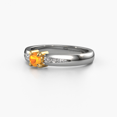 Der oben gezeigte Weißgold Verlobungsring wird Zohra genannt. Es ist ein Pavé Solitär Ring, da er einen zentralen Edelstein und ein Band mit Pavé-Fassung hat. Der moderne Pavé Solitär Verlobungsring ist in der Kombination 14 Karat Weißgold mit Gold und ist mit einem rund 4 mm Citrin-Mittelstein besetzt und das Band hat eine Pavé-Fassung mit Diamanten. Jedes Schmuckstück wird von unseren Meister-Goldschmieden in unserem eigenen Studio für Sie gefertigt. Um den zentralen Stein noch mehr zu betonen, hat das Band eine Pavé-Fassung mit weiteren Citrin. Durch die offenen Krappen kann das Licht aus mehreren Winkeln auf den Citrin treffen und der Citrin-Ring funkelt noch mehr. Das obere Foto zeigt die leidenschaftlich handgefertigten Details des Rings. Die hohe Positionierung der Mittelstein ist ein echter Blickfang. Der perfekte Verlobungsring für das Kronjuwel Ihres Lebens!Da wir unsere eigenen Ringe entwerfen und liefern, können wir Ihnen einen Verlobungsring zu einem Preis anbieten, den Sie nirgendwo anders finden. Ein Ring wird auf Bestellung angefertigt, wodurch kein überschüssiges Material anfällt. So können wir Ihnen ein gutes Angebot zum besten Preis machen. Wir verstehen, dass es sich riskant anfühlt, Ihren Verlobungsring online zu kaufen. Jedoch helfen wir Ihnen gerne beim Designprozess unter Berücksichtigung Ihres Budgets.Unser Team fügt unserer Online-Kollektion täglich neue Designs hinzu. Unsere Designer und Goldschmiede arbeiten zusammen, um das beste Design zu kreieren. Wir bemühen uns, eine vielfältige Kollektion von Schmuckstücken anzubieten. Vielleicht haben Sie ein bestimmtes Design im Sinn. Eines, dass Sie irgendwo gesehen haben. Gerne geben wir Ihnen eine kostenlose Beratung. Wir machen Ihnen ein Angebot, basierend auf einem fairen Preis/Leistungsverhältnis, das Sie verblüffen wird.Um es einfacher zu machen, bieten wir eine kostenlose 30-tägige Rücksendung.