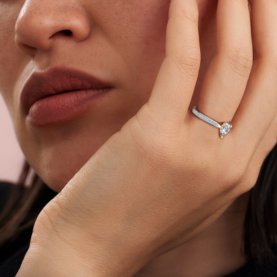 Der oben gezeigte Weißgold Verlobungsring wird Mignon PER 2 genannt. Es ist ein Pavé Solitär Ring, da er einen zentralen Edelstein und ein Band mit Pavé-Fassung hat. Der trendige Pavé Solitär Verlobungsring ist in der Kombination 585 Weißgold mit Gold und ist mit einem tropfen 1.00 crt Diamant-Mittelstein besetzt und das Band hat eine Pavé-Fassung mit Diamanten. Jedes Schmuckstück wird von unseren Meister-Goldschmieden in unserem eigenen Studio für Sie gefertigt. Um den zentralen Stein noch mehr zu betonen, hat das Band eine Pavé-Fassung mit weiteren Diamant. Durch die offenen Krappen kann das Licht aus mehreren Winkeln auf den Diamant treffen und der Diamant-Ring funkelt noch mehr. Das obere Foto zeigt die leidenschaftlich handgefertigten Details des Rings. Die hohe Positionierung der Mittelstein ist ein echter Blickfang. Der perfekte Verlobungsring für das Kronjuwel Ihres Lebens!Haben Sie ein bestimmtes Budget? Sie können uns gerne kontaktieren, damit wir Ihre Optionen besprechen können. Wir bieten unsere Verlobungsringe zum garantiert besten Preis, denn wir fertigen sie auf Bestellung. Solche Preise finden Sie nirgendwo anders!Unser Team fügt unserer Online-Kollektion täglich neue Designs hinzu. Unsere Designer und Goldschmiede arbeiten zusammen, um das beste Design zu kreieren. Wir bemühen uns, eine vielfältige Kollektion von Schmuckstücken anzubieten. Vielleicht haben Sie ein bestimmtes Design im Sinn. Eines, dass Sie irgendwo gesehen haben. Gerne geben wir Ihnen eine kostenlose Beratung. Wir machen Ihnen ein Angebot, basierend auf einem fairen Preis/Leistungsverhältnis, das Sie verblüffen wird.Um es einfacher zu machen, bieten wir eine kostenlose 30-tägige Rücksendung.