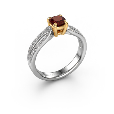 Der oben gezeigte Weißgold Verlobungsring wird Antonia cus 2 genannt. Es ist ein Pavé Solitär Ring, da er einen zentralen Edelstein und ein Band mit Pavé-Fassung hat. Der Fantasie Pavé Solitär Verlobungsring ist in der Kombination 14 Karat Weißgold mit Gold und ist mit einem cussion 5 mm Granat-Mittelstein besetzt und das Band hat eine Pavé-Fassung mit Lab grown Diamant. Jedes Schmuckstück wird von unseren Meister-Goldschmieden in unserem eigenen Studio für Sie gefertigt. Um den zentralen Stein noch mehr zu betonen, hat das Band eine Pavé-Fassung mit weiteren Granat. Durch die offenen Krappen kann das Licht aus mehreren Winkeln auf den Granat treffen und der Granat-Ring funkelt noch mehr. Das obere Foto zeigt die leidenschaftlich handgefertigten Details des Rings. Die hohe Positionierung der Mittelstein ist ein echter Blickfang. Der perfekte Verlobungsring für das Kronjuwel Ihres Lebens!Mit unserer modernen Technik können wir Schmuckstücke von höchster Qualität mit größter Sorgfalt für Sie entwerfen und anpassen. Unsere Verlobungsringe sind immer um 30 Prozent günstiger als bei anderen Juwelieren. Wir fertigen Verlobungsringe auf Bestellung, also müssen wir keine großen Lager unterhalten. Wenn Sie ein bestimmtes Budget haben, beraten wir Sie gerne entsprechend.Haben Sie irgendwo einen bestimmten Verlobungsring gefunden, den Sie Ihrem Liebsten schenken möchten? Sie können uns gerne sagen, was Sie wollen und wir werden Ihr Design in einen Einzigartigen Fantasie Verlobungsring verwandeln. Sie können die Entwicklungen Ihres Ringdesigns verfolgen, da wir 3D-Zeichnungen verwenden. Das gibt Ihnen eine realistische Vorschau, wie Ihr Design aussehen wird. Sie können auch einen Dummy vorbestellen. Ein Dummy ist ein Kunststoffring, der nach Ihrem Ringdesign gestaltet werden kann. Sie können ihn anprobieren und prüfen, ob seine Breite und Größe für Sie geeignet sind. Wir senden Ihnen gerne ein unverbindliches Angebot zu einem fairen Preis/Leistungsverhältnis. Sie werden in Anbetracht der Qualität des Rings und der Edelsteine überrascht sein.Um es einfacher zu machen, bieten wir eine kostenlose 30-tägige Rücksendung.