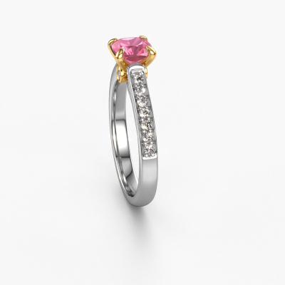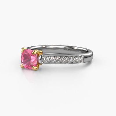Der oben gezeigte Weißgold Verlobungsring wird Valorie cus 2 genannt. Es ist ein Pavé Solitär Ring, da er einen zentralen Edelstein und ein Band mit Pavé-Fassung hat. Der traditionell Pavé Solitär Verlobungsring ist in der Kombination 14 Karat Weißgold mit Gold und ist mit einem cussion 5.5 mm Pink Saphir-Mittelstein besetzt und das Band hat eine Pavé-Fassung mit Diamanten. Jedes Schmuckstück wird von unseren Meister-Goldschmieden in unserem eigenen Studio für Sie gefertigt. Um den zentralen Stein noch mehr zu betonen, hat das Band eine Pavé-Fassung mit weiteren Pink Saphir. Durch die offenen Krappen kann das Licht aus mehreren Winkeln auf den Pink Saphir treffen und der Pink Saphir-Ring funkelt noch mehr. Das obere Foto zeigt die leidenschaftlich handgefertigten Details des Rings. Die hohe Positionierung der Mittelstein ist ein echter Blickfang. Der perfekte Verlobungsring für das Kronjuwel Ihres Lebens!Durch die Kombination modernster Technik mit uralter Handwerkskunst können wir alle Verlobungsringe in unserem eigenen Studio anfertigen. Jedes Schmuckstück wird auf Anfrage gefertigt. Das ist vorteilhaft, weil wir Ihnen dadurch einen Preis anbieten können, den Sie nirgendwo anders finden.Unsere Designer und Goldschmiede arbeiten jeden Tag zusammen und versuchen, neue Schmuckstücke zu kreieren. Vielleicht haben Sie irgendwo einen schönen, traditionell Verlobungsring gefunden, nach dem Ihr einzigartiger Ring gestaltet werden kann. Setzen Sie sich mit uns in Verbindung. Wir machen Ihnen ein Angebot, basierend auf einem fairen Preis/Leistungsverhältnis, das Sie begeistern wird.Um es einfacher zu machen, bieten wir eine kostenlose 30-tägige Rücksendung.