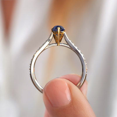 Der oben gezeigte Weißgold Verlobungsring wird Mignon per 2 genannt. Es ist ein Pavé Solitär Ring, da er einen zentralen Edelstein und ein Band mit Pavé-Fassung hat. Der trendige Pavé Solitär Verlobungsring ist in der Kombination 14 Karat Weißgold mit Gold und ist mit einem tropfen 6.5x4.5 mm Saphir-Mittelstein besetzt und das Band hat eine Pavé-Fassung mit Diamanten. Jedes Schmuckstück wird von unseren Meister-Goldschmieden in unserem eigenen Studio für Sie gefertigt. Um den zentralen Stein noch mehr zu betonen, hat das Band eine Pavé-Fassung mit weiteren Saphir. Durch die offenen Krappen kann das Licht aus mehreren Winkeln auf den Saphir treffen und der Saphir-Ring funkelt noch mehr. Das obere Foto zeigt die leidenschaftlich handgefertigten Details des Rings. Die hohe Positionierung der Mittelstein ist ein echter Blickfang. Der perfekte Verlobungsring für das Kronjuwel Ihres Lebens!Haben Sie ein bestimmtes Budget? Sie können uns gerne kontaktieren, damit wir Ihre Optionen besprechen können. Wir bieten unsere Verlobungsringe zum garantiert besten Preis, denn wir fertigen sie auf Bestellung. Solche Preise finden Sie nirgendwo anders!Unser Team fügt unserer Online-Kollektion täglich neue Designs hinzu. Unsere Designer und Goldschmiede arbeiten zusammen, um das beste Design zu kreieren. Wir bemühen uns, eine vielfältige Kollektion von Schmuckstücken anzubieten. Vielleicht haben Sie ein bestimmtes Design im Sinn. Eines, dass Sie irgendwo gesehen haben. Gerne geben wir Ihnen eine kostenlose Beratung. Wir machen Ihnen ein Angebot, basierend auf einem fairen Preis/Leistungsverhältnis, das Sie verblüffen wird.Um es einfacher zu machen, bieten wir eine kostenlose 30-tägige Rücksendung.