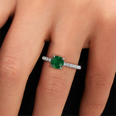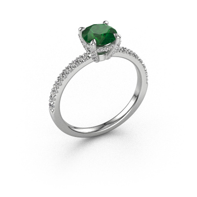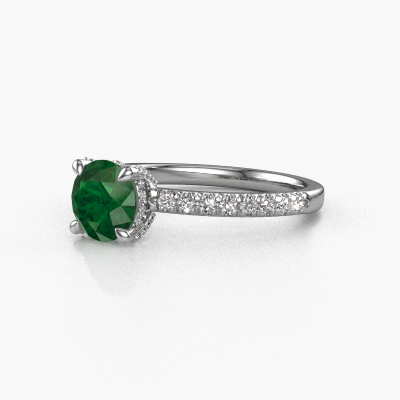 Der oben gezeigte Weißgold Verlobungsring wird Saskia rnd 1 genannt. Es ist ein Pavé Solitär Ring, da er einen zentralen Edelstein und ein Band mit Pavé-Fassung hat. Der exklusive Pavé Solitär Verlobungsring ist in der Kombination 14 Karat Weißgold mit Weißgold und ist mit einem rund 6.5 mm Smaragd-Mittelstein besetzt und das Band hat eine Pavé-Fassung mit Lab grown Diamant. Jedes Schmuckstück wird hergestellt mit Leidenschaft und Liebe, von einem unserer Meister-Goldschmiede. Um den zentralen Stein noch mehr zu betonen, hat das Band eine Pavé-Fassung mit weiteren Smaragd. Durch die offenen Krappen kann das Licht aus mehreren Winkeln auf den Smaragd treffen und der Smaragd-Ring funkelt noch mehr. Das obere Foto zeigt die leidenschaftlich handgefertigten Details des Rings. Die hohe Positionierung der Mittelstein ist ein echter Blickfang. Der perfekte Verlobungsring für das Kronjuwel Ihres Lebens!Durch die Kombination modernster Technik mit uralter Handwerkskunst können wir alle Verlobungsringe in unserem eigenen Studio anfertigen. Jedes Schmuckstück wird auf Anfrage gefertigt. Das ist vorteilhaft, weil wir Ihnen dadurch einen Preis anbieten können, den Sie nirgendwo anders finden.Haben Sie einen bestimmten Ring im Sinn? Eines, dass Sie irgendwo gesehen haben. Bitte zögern Sie nicht, uns zu sagen, was Sie wollen und wir werden Ihr Design in einen Einzigartigen Verlobungsring verwandeln. Sie können die Entwicklungen Ihres Ringdesigns verfolgen, da wir 3D-Zeichnungen verwenden. Das gibt Ihnen eine realistische Vorschau Ihres Designs. Wir senden Ihnen gerne ein unverbindliches Angebot zu einem fairen Preis/Leistungsverhältnis. Es wird Sie erstaunen.Um es einfacher zu machen, bieten wir eine kostenlose 30-tägige Rücksendung.